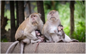 A family of macaques, including adults and babies,