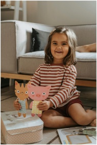 Smiling child in striped shirt happily playing with paper dolls on a cozy sofa.