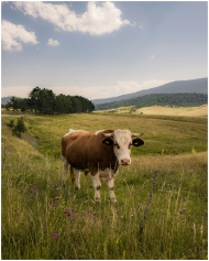 Serene shot of a cow grazing in the scenic fields of Zlatibor, Serbia.