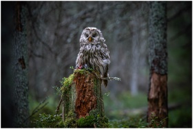 A Ural owl sits majestically on a moss-covered tre