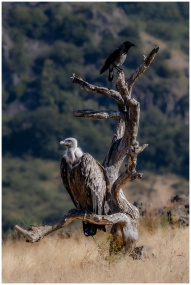 A vulture and crow perched on a dead tree in a wild landscape, depicting wildlife coexistence.