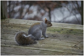A grey squirrel sitting on a wooden deck surrounded by scattered seeds in a natural park setting.