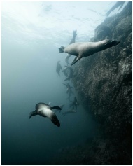 A group of sea lions gracefully swimming underwater near rocky terrain in B.C., Mexico.
