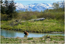 Grizzly bear wading in a stream, surrounded by Alaskan wilderness and snow-capped mountains.