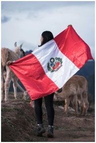 A woman holding the Peruvian flag stands in a rural setting with llamas in Cusco, Peru.