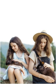 Two young girls sitting outdoors petting black rab