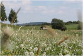Idyllic rural scene with horses grazing in a lush, flower-filled field in Sweden.