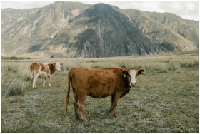 Two cows grazing in a serene mountain landscape, showcasing pastoral life.