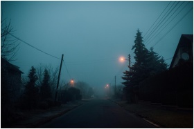 A foggy suburban street with street lights illuminating the misty atmosphere at twilight.