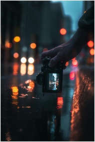 Capturing a moody night scene in downtown Minneapolis with vibrant reflections.