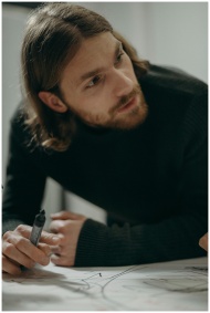 Man with beard and long hair concentrating while writing with a marker in an office setting.