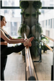Adult woman practicing yoga and stretching exercises indoors at a studio.