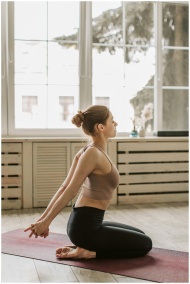 Woman performing a yoga pose indoors by a window, embodying calmness and flexibility.