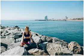A woman in activewear meditates on rocky shore with the Barcelona skyline in the background.