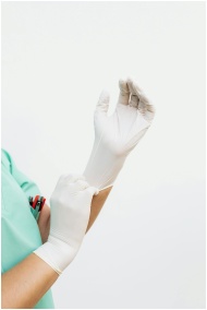 A healthcare worker in green scrubs wearing white surgical gloves, preparing for procedure.