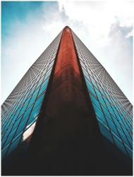 Striking low angle view of a modern skyscraper with reflective glass windows against a blue sky.