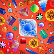 Vibrant abstract design featuring diverse geometric shapes on a red background.