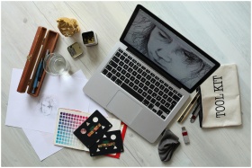 Top view of a creative workspace with a laptop, sk