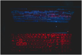 Dark-themed laptop setup with a red glowing keyboard and code on screen, ideal for tech enthusiasts.