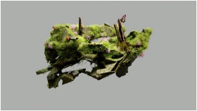 A surreal CGI depiction of a floating island with lush greenery and a butterfly.