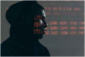 Side profile of a man in a hoodie, surrounded by red code, depicting cybersecurity theme.