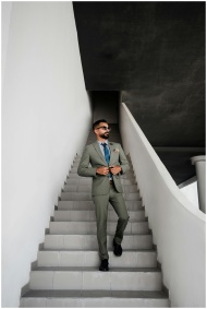 A fashionable man in a suit walking up stairs in Dubai, projecting confidence and style.