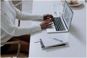 A person typing on a laptop in a minimalistic home