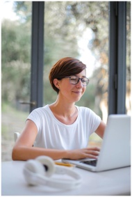 A happy woman with short hair using a laptop indoo
