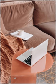 A modern laptop on a stylish table with warm decor in a comfortable living room setting.