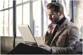 Man looking contemplative while working on a lapto