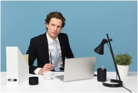 A focused businessman in a suit works at his tidy