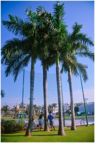 Tall palm trees standing over people at an outdoor recreation area, set against a blue sky.
