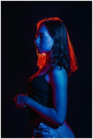 Blue and red lighting highlights a woman posing in a dark studio setting.