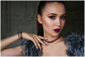 Close-up portrait of an elegant woman with bold ma