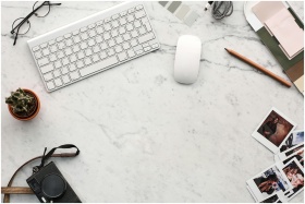 Top view of a minimalist workspace with a keyboard, camera, and instant photos on a marble desk.