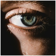 Intimate close-up of a human eye with dramatic lighting, highlighting the iris and eyelashes.
