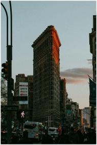 Capturing the Flatiron Building with urban hustle and sunset hues in New York City.