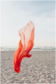 A vivid orange fabric floats gracefully over the sandy shore of Karwia Beach, Poland.