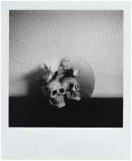 Monochrome image of skulls reflected in a mirror with artistic composition.