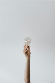 A hand raises a light bulb against a soft gray background, symbolizing creativity and ideas.