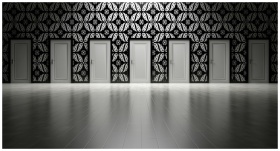 Five closed doors in a black and white ornate hallway symbolizing opportunities and decisions.