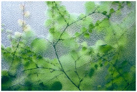 Delicate green leaves on thin twigs of fresh plant growing near glass window