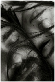 Close-up black and white portrait of two people with eyes closed and hair gently falling.