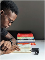A man immersed in reading a book at a table surrou