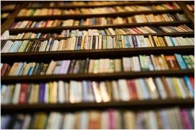 A low angle view of bookshelves filled with books in a library, showcasing a variety of spines.