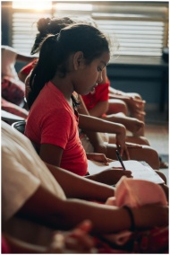 A young girl deeply focused on her studies, sittin