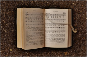 An open hymn book with musical notes laying on ear