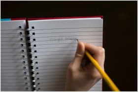 A close-up of a hand using a pencil to write in a spiral notebook with lined pages.