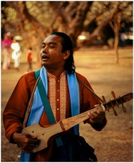 A singer is playing guiter and sing song in a park