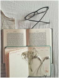 Flat lay of an open book, planner, and eyeglasses creating a cozy and intellectual setting.